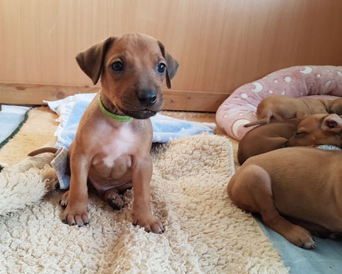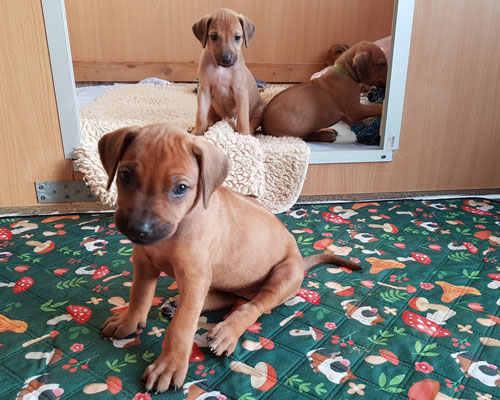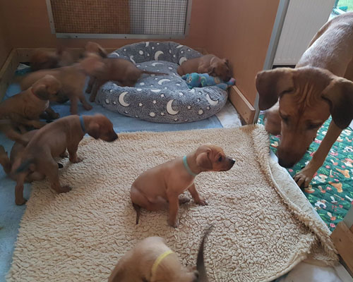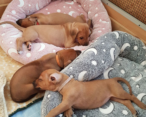 | Finesse zeigt den Welpen, dass die Hundebox ein gemütlicher Rückzugsort ist... | ...was diese sofort verstanden haben. | ||