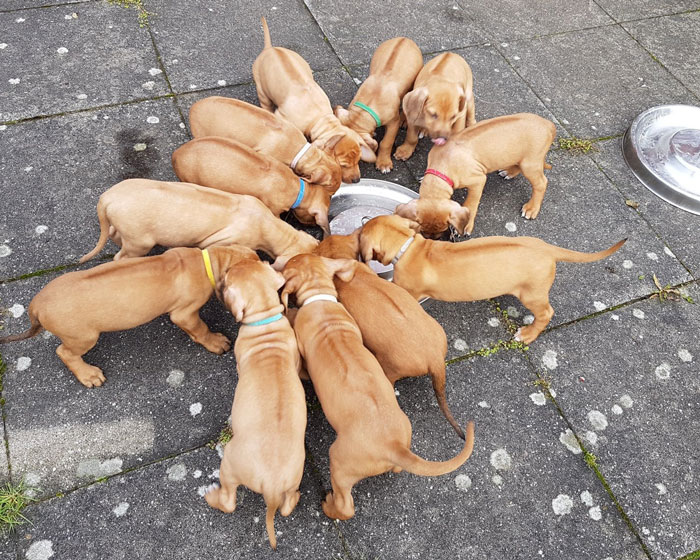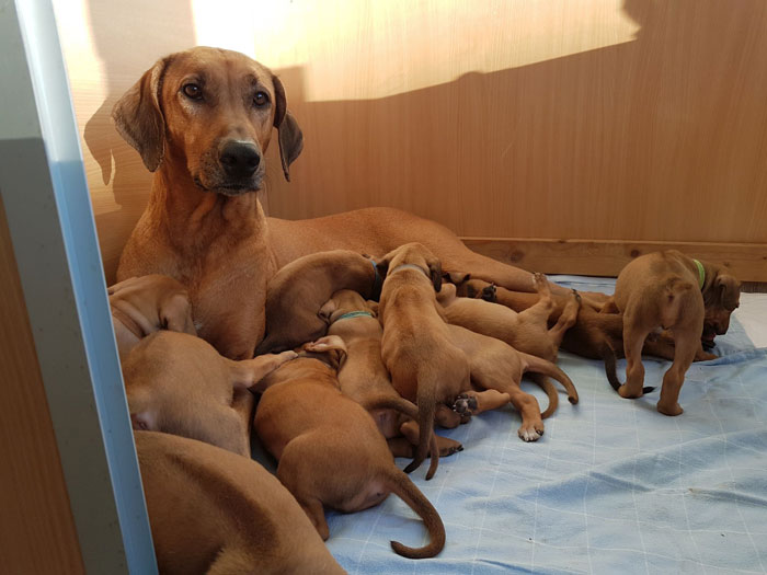 Finesse mit ihren 12 neugeborenen Welpen. |