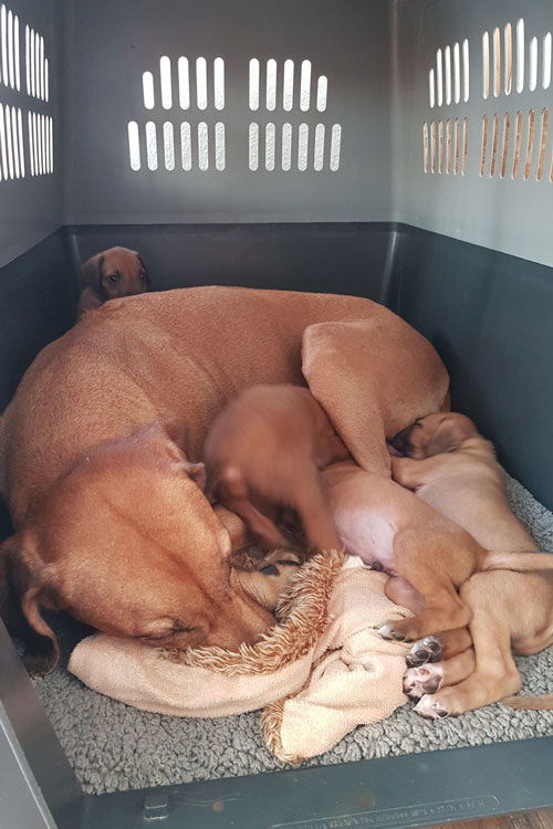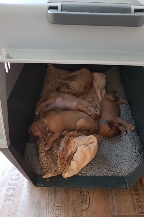 | Finesse zeigt den Welpen, dass die Hundebox ein gemütlicher Rückzugsort ist... | ...was diese sofort verstanden haben. | ||